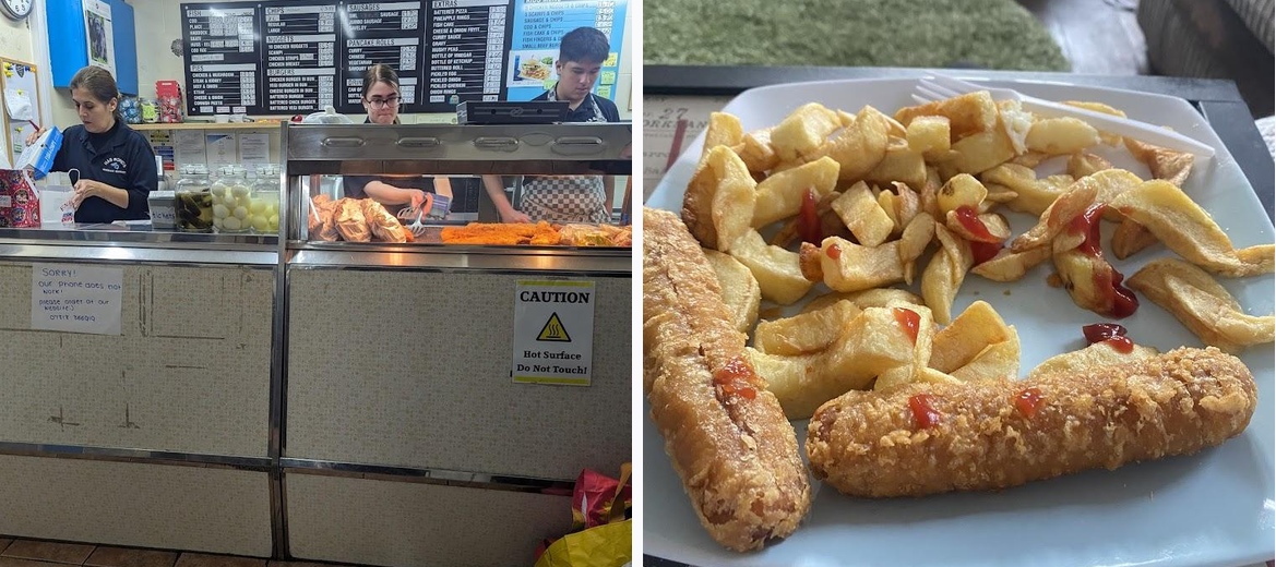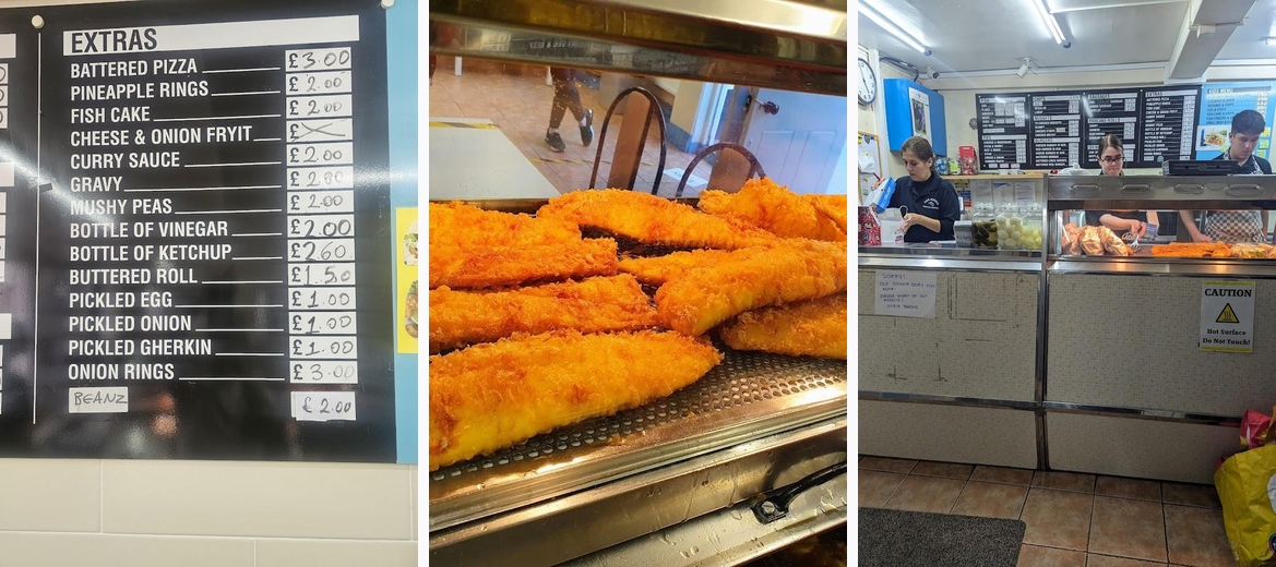 Incredibly affordable and consistently yummy. I've been coming once a week with my sister and friend for the last 3 months, and within about 3 visits, they had our faces and order memorised ! The 3 of us share a £5 XL portion of chips (the friend also gets a jumbo sausage for herself) as our dinner before work, and it's always enough to fill us all up. The staff are all very friendly and the atmosphere is about as good as a little fish and chip shop could be.